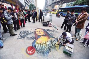 Cong Langui, 52, who sits on a square in Shapingba District, drew a "Mona Lisa," one of the world's most famous paintings, on the ground using a lump of charcoal on Tuesday.
