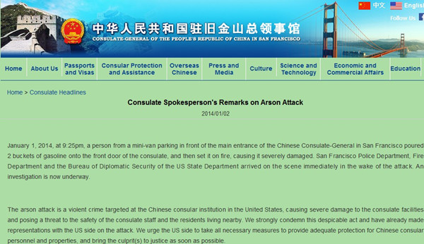 (ECNS) -- A person poured 2 buckets of gasoline onto the front door of the Chinese Consulate-General in San Francisco and lit it late Wednesday, causing it severely damaged, according to the consulate's website.