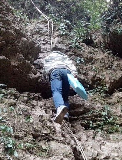 In Shuitian county, Baojing town of the Tujia and Miao autonomous prefecture in western Hunan, middle school students face a treacherous journey on their weekly school commute. Part of it involves climbing down a ten-meter-high cliff, using a rope tied to a tree.