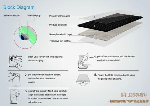 Based on the piezoelectric effect principle, the protector produces power when a user operates the smartphone, and a USB plug at the bottom of the protector can input power to the phone when connected to it, Cai added.