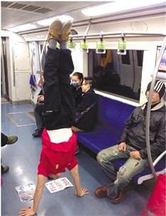 Zhang Shangwu, a former star gymnast, performs handstands on Beijing subway.
