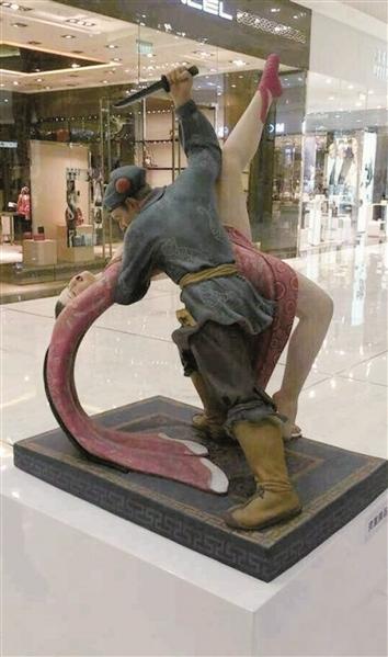(ECNS) -- A sculpture in a shopping mall in Shenyang, Liaoning province, has caused controversy among netizens over the lines between culture, art and social decency, the Dalian Evening News reported on Monday.