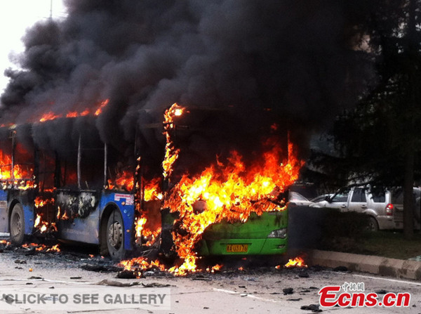 A netizen posted on Twitter-like service Sina Weibo that around 12:50 pm seemingly spontaneous blazes swept through a No. 237 bus in front of a primary school on Jinyang South Street in Yunyan district, Guiyang city.
