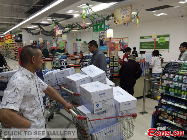 Citizens in Jingjiang are rushing to buy bottled water after the water suspension notice was released.