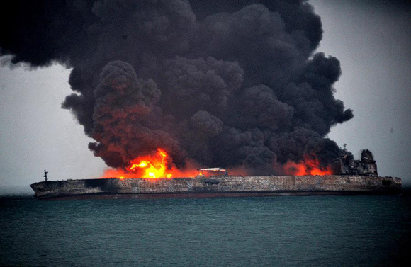 The Panama-registered oil tanker Sanchi is seen ablaze on Jan 7, 2018. The tanker carrying 136,000 metric tons of light crude oil has been adrift and on fire following a collision with another vessel in the East China Sea on Jan. 6. (Photo/Xinhua)