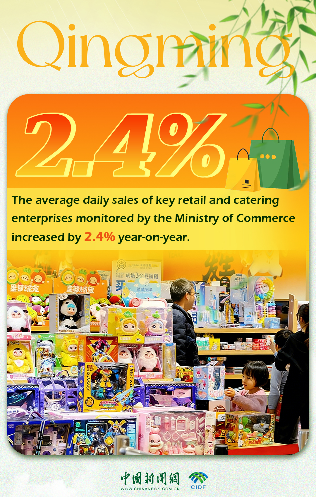 During the three-day Qingming Festival holiday, the average daily sales of key retail and catering enterprises monitored by the Ministry of Commerce increased by 2.4 percent year-on-year.