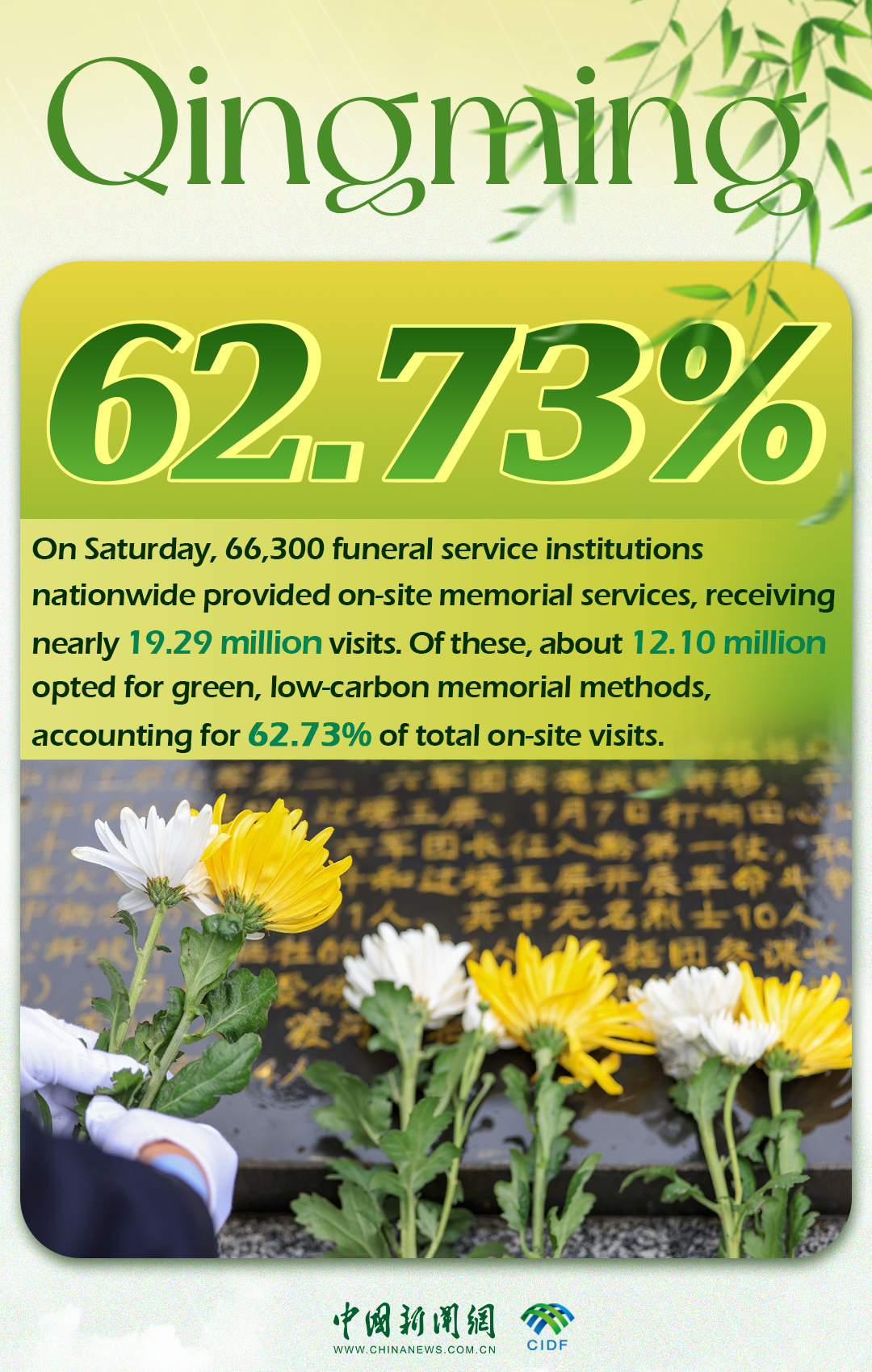 Qingming, which fell on Saturday this year, is an occasion for Chinese people to honor deceased family members. Data from the Ministry of Civil Affairs showed that on Saturday, 66,300 funeral service institutions nationwide provided on-site memorial services, receiving nearly 19.29 million visits. Of these, about 12.10 million opted for green, low-carbon memorial methods, accounting for 62.73% of total on-site visits.