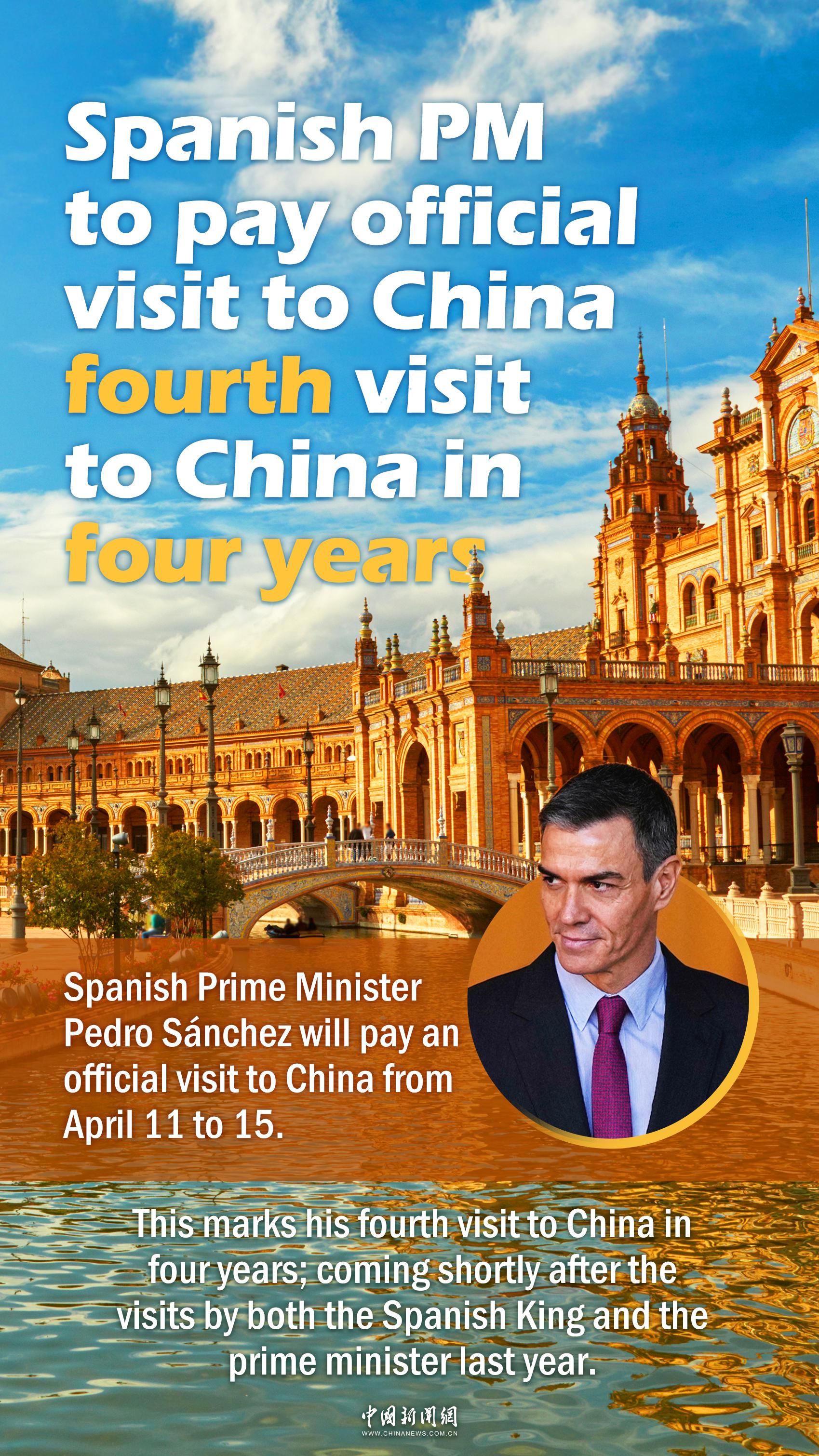 Spanish Prime Minister Pedro Sanchez will pay an official visit to China from April 11 to 15. This marks Sanchez's fourth visit to China in a four-year period, and it represents another significant high-level exchange between China and Spain in a short period, following the visits by Spanish King Felipe VI and Sanchez last year.