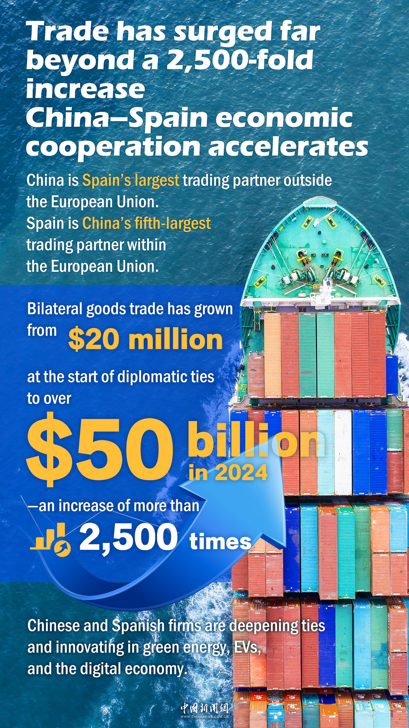China–Spain economic and trade relations are highly complementary, dynamic, and resilient. In 2025, the bilateral trade volume in goods between China and Spain exceeded $55 billion - a year-on-year increase of 9.8 percent - firmly cementing China's position as Spain's largest trading partner outside the European Union.