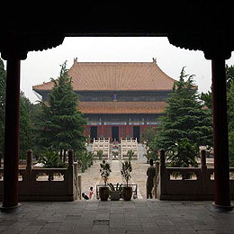 The three courtyards in the front and at the back of the Changling Tomb are of the same width, and are encircled by high walls. Inside the tomb gate, the first courtyard is very shallow, the second square, vertical and long. The entrance is the Lingen Gate. On the first line of the middle pillar, three doors are open on the single-layer stone platform encircled by white stone balustrades very much like Taihemen Gate in theForbidden City. The Lingen Hall, the key structure in the second courtyard, is at the rear. Its shape and structure are the same as the Taihe Hall. The frontal width of Lingen Hall is slightly bigger than that of Taihe hail, but the former's depth is shallower It is the second largest hall existing in China. Under the hall, there are three layers of stone platforms encircled by stone balustrades. The 32 large pillars inside the hall are all made with super-quality gold filigreed nanmu timber.