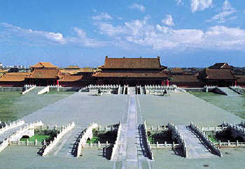 The Forbidden City is the second section of the city of Beijing, running from Damingmen (no longer existing, the starting-point of the palatial zone to the north of Zhengya- ngmen , through Huangcheng and Gongcheng in the north to the peak of Jingshan Hill. The axis is 2,500 meters long and can be divided into three smaller sections again similar to a symphony of three movements--prelude, climax and coda. The first is the longest, stretching from Damingmen to Wumen in the front gate of Gongcheng, consisting of three squares strung together in front of the Palace, serving as the leading space. The second is the Forbidden City itself, composed of the three parts of Qianchao (front court), Houqin (back bedroom) and Yuhuayuan (imperial garden), which is the climax; the third is the shortest, stretching from Shenwumen, the north gate of the Forbidden City, to Wanchun Pavilion, the peak of jingshan. -I-he artistic role and artistic methods of each section, and of each sector of various sections, are different, however They are linked to, and echo each other They were accomplished in one go to jointly serve the theme of playing up the imperial authority.