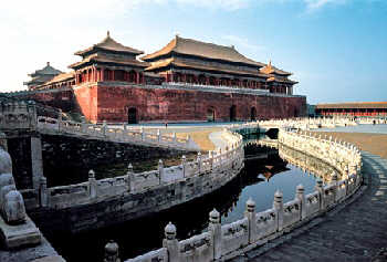 In front of Tiananmen, the square Suddenly expands horizontally. The tall tower stands on the rostrum of the city, five gates open under the rostrum; in front of the gate, there are the Jinshuiqiao (golden water bridges) protruding southward and the five stone arch bridges facing the five gates. The white stone bridge balustrade, the marble pillar and thestone lions, and the red walls and yellow tiles complement each other in radiance and beauty, appearing to be very brilliant, and making the atmosphere broad and magnificent, thus constituting the first climax of the leading alignment. This Outstanding method of preceding high with low is often used in designing Chinese building complexes.Chinese architectureis crystal clear at a glance, with emphasis placed on implication and an inward looking approach.