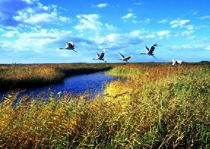 It features more than 20 types of trees and 200 types of plants, with three major rivers flowing through. As a paradise for birds, it is the home of 293 species of rare birds, including six breeds of cranes. It earned the reputation of "the hometown of cranes", due to the large groups of cranes and the number of crane species. There are also some other wild animals living in the area including roes, Mongolian rabbits, wolves, and fishes.
