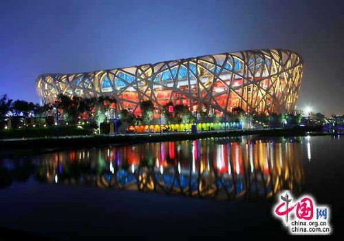 The National Stadium, as the main track and field stadium for the 2008 Olympics Games, is dubbed the "bird's nest" because of its innovative grid formation. The twig-like structural elements and the bowl-shaped roof are the masterpiece of the project, yet they posed great challenges for technicians and workers during construction. The stadium was begun in March 2004 and finished in March 2008. It was built with 36 kilometers of unwrapped steel, with a combined weight of 45,000 tonnes. Covering over 258,000 square meters, the stadium has at least 100,000 seats.