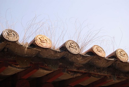 Roof tiles, or wa in Chinese, appeared as early as in the Xia Dynasty(2100-1600BC), serving to protect inhabitants from weather hazards and intruders. Its calligraphic style of xiaozhuan (lesser seal script) vividly portrays the tiles: laid one over another and joined together by lime in alternating and curved rows, concave and convex, on the roof.