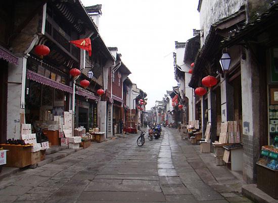 Located in the center of Tunxi District, Huangshan City, Anhui Province, the street, paved with maroon flagstones, has a total length of 1,273 meters, of which 895 meters is the pedestrian commercial street. Two and three-storey shops line both sides of the streets and feature the local Anhui style of architecture including a stone base, brick construction and tile roof. The buildings typically house shops at the front, with houses and workshops being located at the rear. The street developed into the distribution center for materials in and out of Anhui in the Qing Dynasty.
