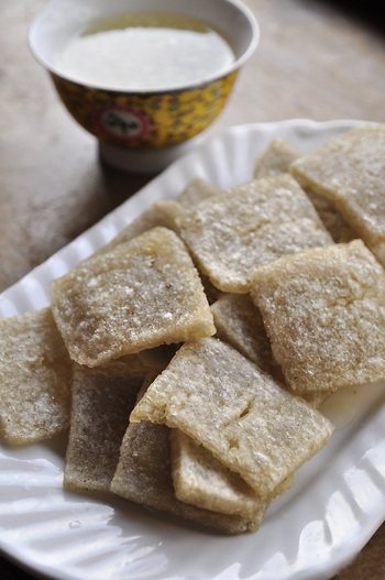 Guan chang, or filled sausage, has been a popular snack in Beijing since the Ming Dynasty (1368-1644). Traditionally, the sausage, a prepared pork intestine, is stuffed with a paste of flour or starch mixed with spices. The sausage is then boiled and cut into cubes or slices to be fried. In some restaurants, minced pork is also used as stuffing. Little bamboo sticks, instead of chopsticks, are the traditional way of eating the filled sausages.