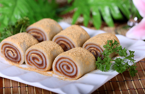 Lv da gun are steamed glutinous rice rolls filled with red bean paste or brown sugar that is then rolled and covered in a soybean flour crumble. Its origins can be traced to the Qing Dynasty. The cake, which has a yellowish color, is sweet and a little sticky, with a very nice bean flavor.
