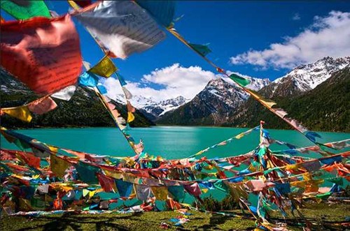 Prayer flags over Lhamo Latso Lake. [Photo/Michael Yamashita Provided to Chinadaily.com.cn]