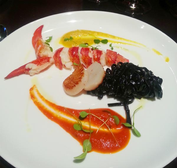 He makes beef carpaccio in the shape of a beautiful rose, as smooth as ice cream. He prepares inkfish tagliolini with sweet-tasting lobster and scallops, accompanied by sauce made with yellow and red bell peppers, a finished dish that looks as beautiful as a painting.