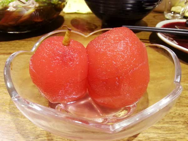 The restaurant makes very good desserts. Cheese "fish" is a light-tasting jelly-like dessert in the shape of a fish. Red bean and yellow pea cake tastes natural and smooth. Red-wine poached pears are very well made and reasonably priced.