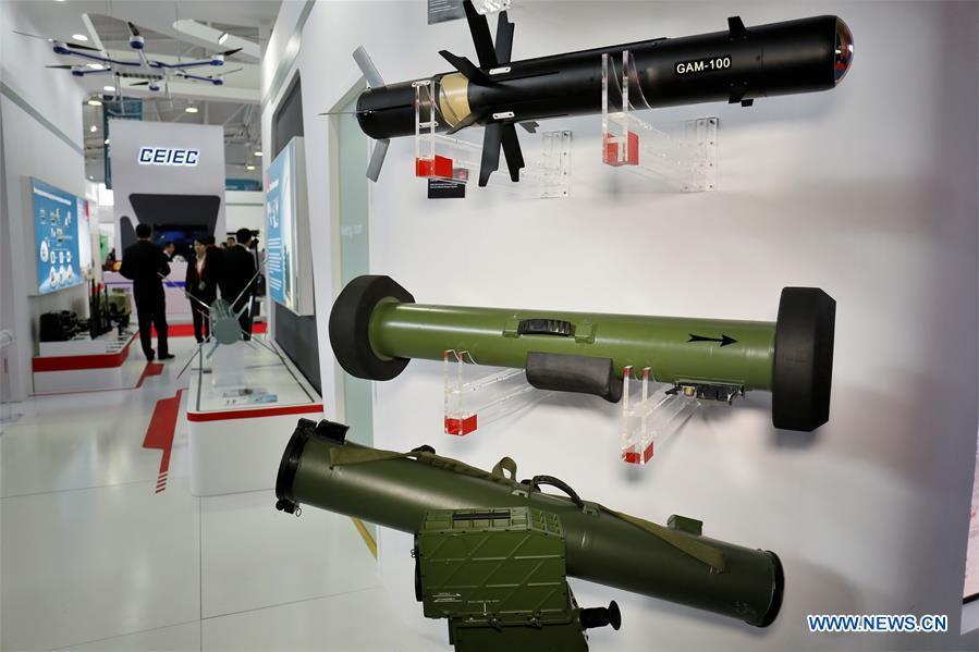 Military products of Chinese company Poly Technologies Inc. are displayed at the Kazakhstan Defense Exhibition in Astana, capital of Kazakhstan, May 23, 2018. Seven Chinese military trade companies took their best products to participate in the exhibition held in Kazakhstan from May 23 to 26. (Xinhua/Aibek Abilov)