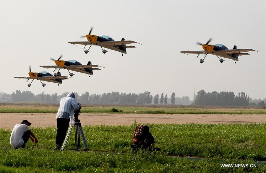 Aerobatics aircrafts perform during a rehearsal for the 10th Air Sports Cultural Tourism Festival in Anyang, central China's Henan Province, May 24, 2018. The three-day air show begins on May 25. (Xinhua/Li An)