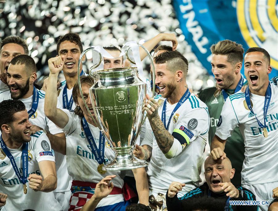 Sergio Ramos (C) of Real Madrid holds the trophy after winning the UEFA Champions League final match between Liverpool and Real Madrid in Kiev, Ukraine on May 26, 2018. Real Madrid claimed the title with 3-1. (Xinhua/Wuzhuang)