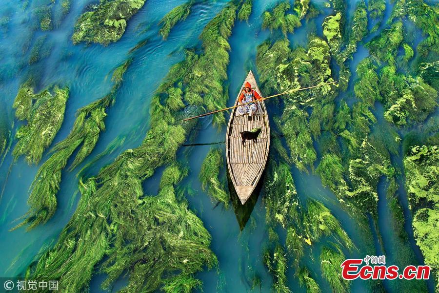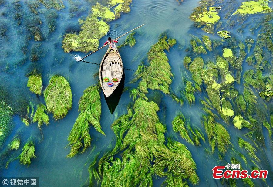 A boat skims over lush green reeds and algae in tranquil Karatoya River in Bogra, Bangladesh, making a stunning "watercolor" scene. (Photo/VCG)