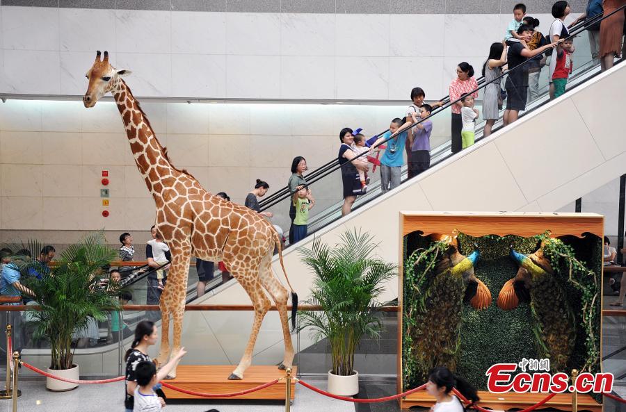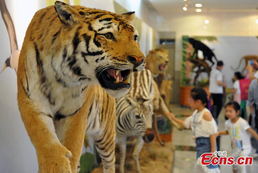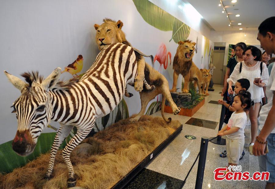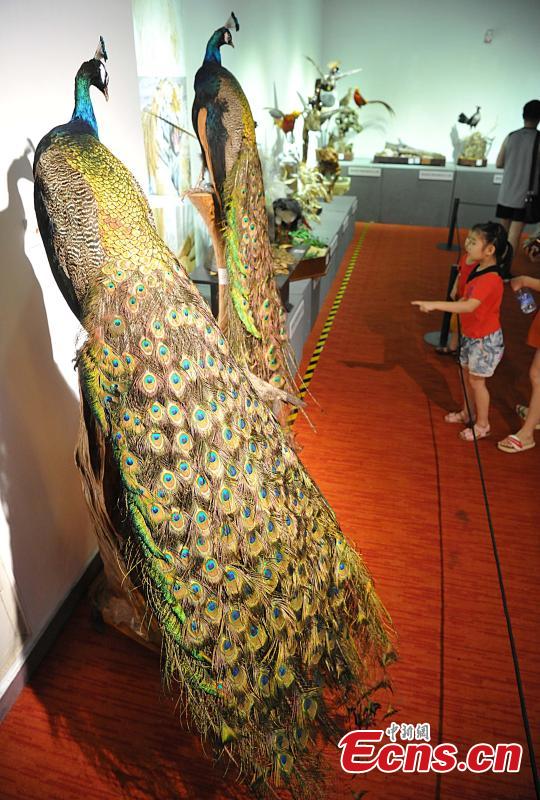 Visitors look at preserved examples during the 4th China Animal Specimens Competition held in Fujian Museum in Fuzhou City, East China’s Fujian Province, May 27, 2018. More than 60 participating organizations including companies and research institutes presented 257 animal specimens in the competition that aims to promote public awareness of biodiversity and ecological protection. (Photo: China News Service/Zhang Bin)