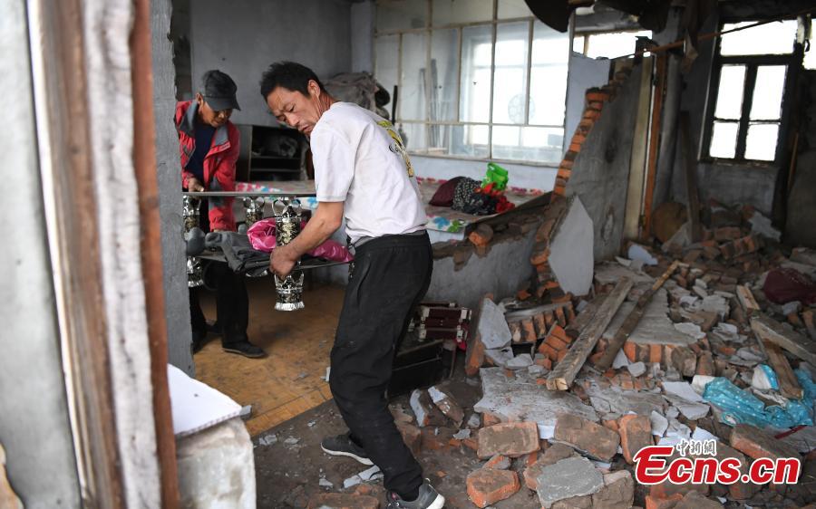 Residents affected by an earthquake move their belongings in Songyuan City, Northeast China’s Jilin Province, May 28, 2018. An earthquake with a magnitude of 5.7 rocked Ningjiang District, Songyuan City on Monday morning, damaging the houses of more than 1,000 families. Local authorities have provided relief supplies to residents affected by the quake. (Photo: China News Service/Zhang Yao)