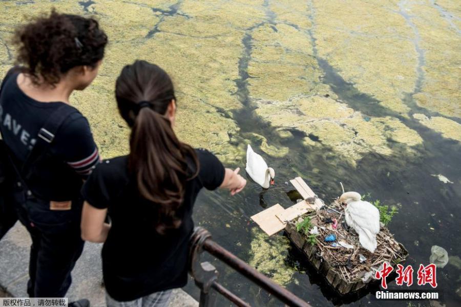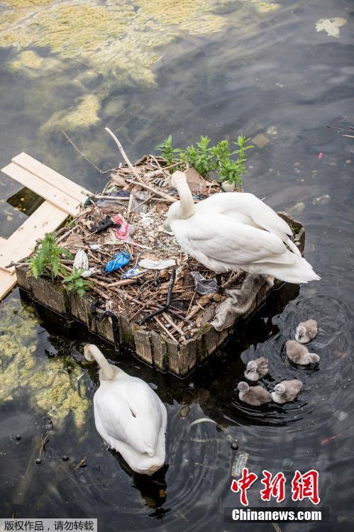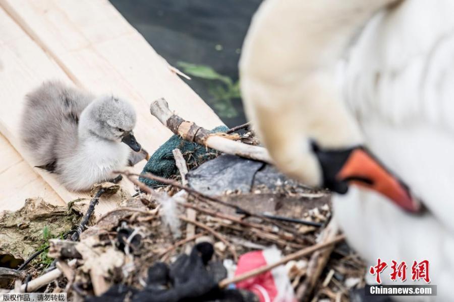 Swans and their cygnets are seen in a nest made partly of rubbish from the lake near Queen Louise's Bridge in Copenhagen, Denmark, May 28, 2018. (Photo/Agencies)