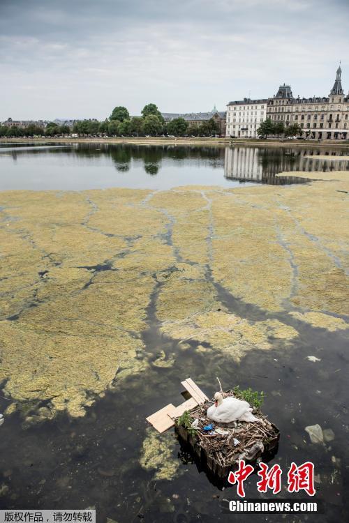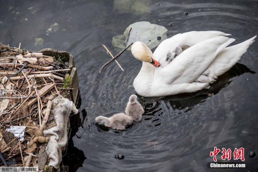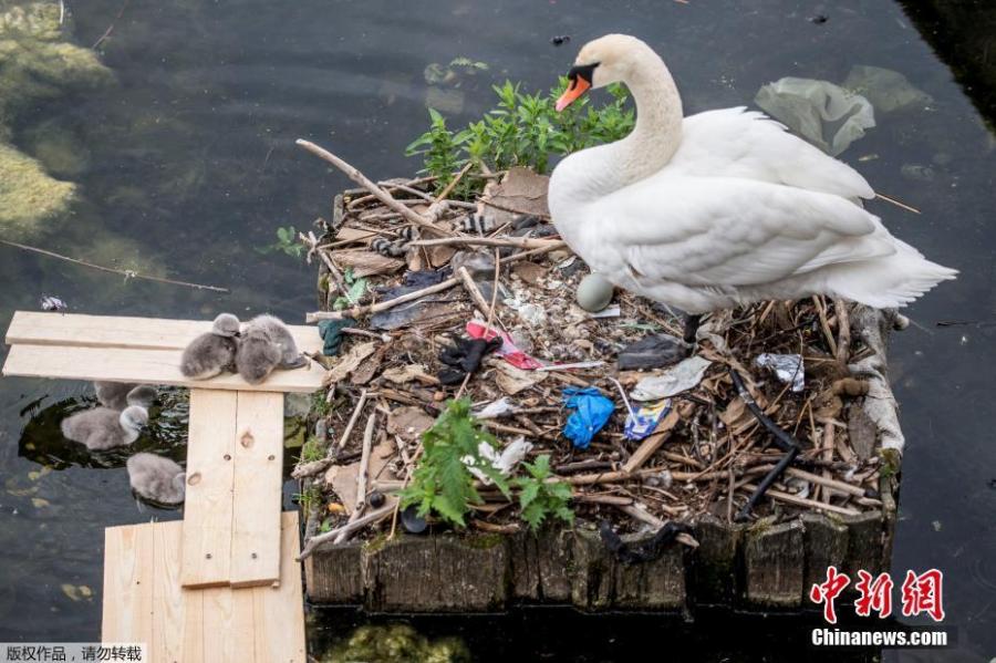 A swan and its cygnets are seen in a nest made partly of rubbish from the lake near Queen Louise's Bridge in Copenhagen, Denmark, May 28, 2018. (Photo/Agencies)