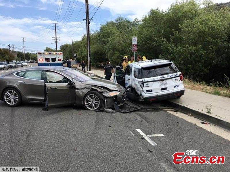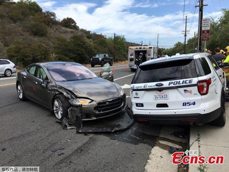 This photo provided by the Laguna Beach Police Department shows a Tesla sedan, left, in autopilot mode that crashed into a parked police cruiser, May 29, 2018, in Laguna Beach, Calif. Police Sgt. Jim Cota says the officer was not in the cruiser at the time of the crash and that the Tesla driver suffered minor injuries. (Photo/Agencies)