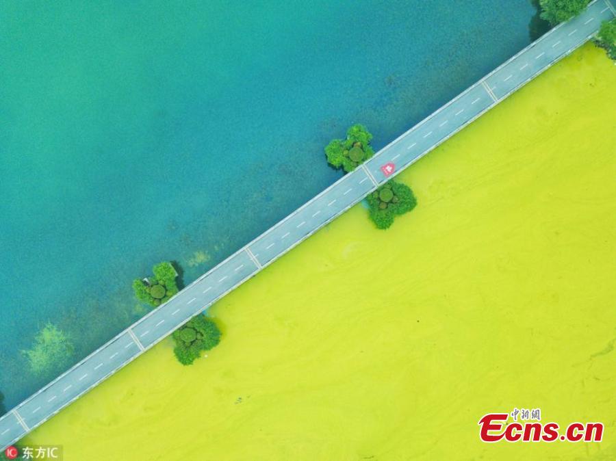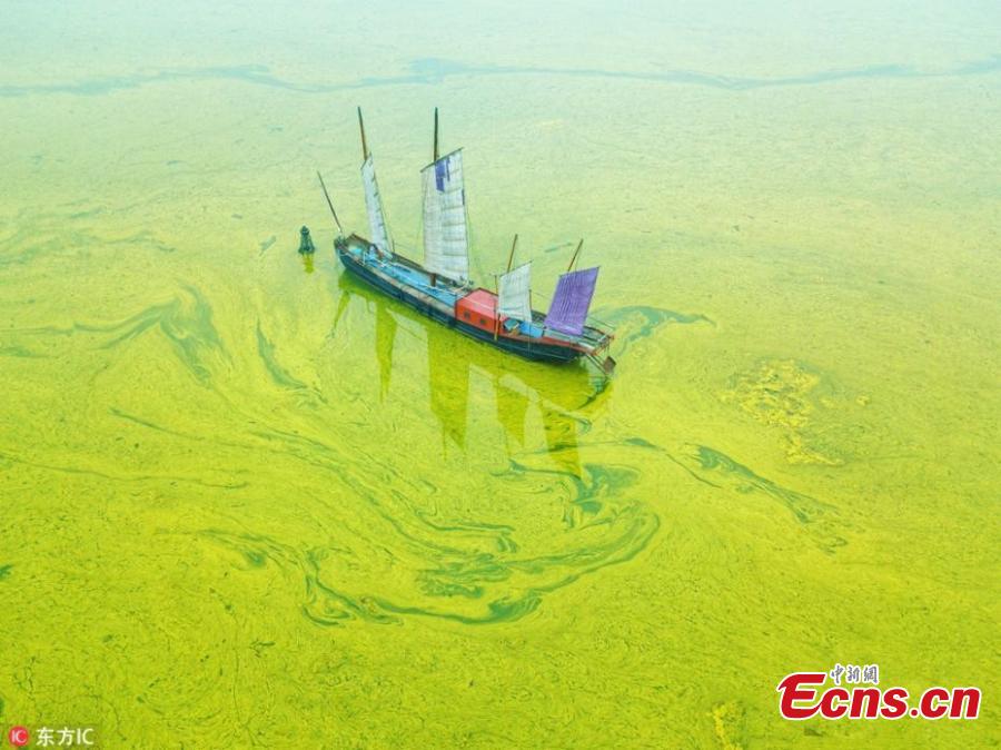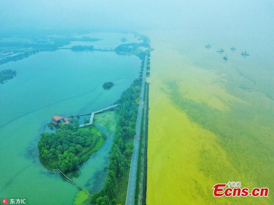 This May 30, 2018 picture shows a blue-green algae bloom in Lake Taihu, one of the largest freshwater lakes in China and located in Wuxi City, Jiangsu Province, as temperatures rise. (Photo/IC)