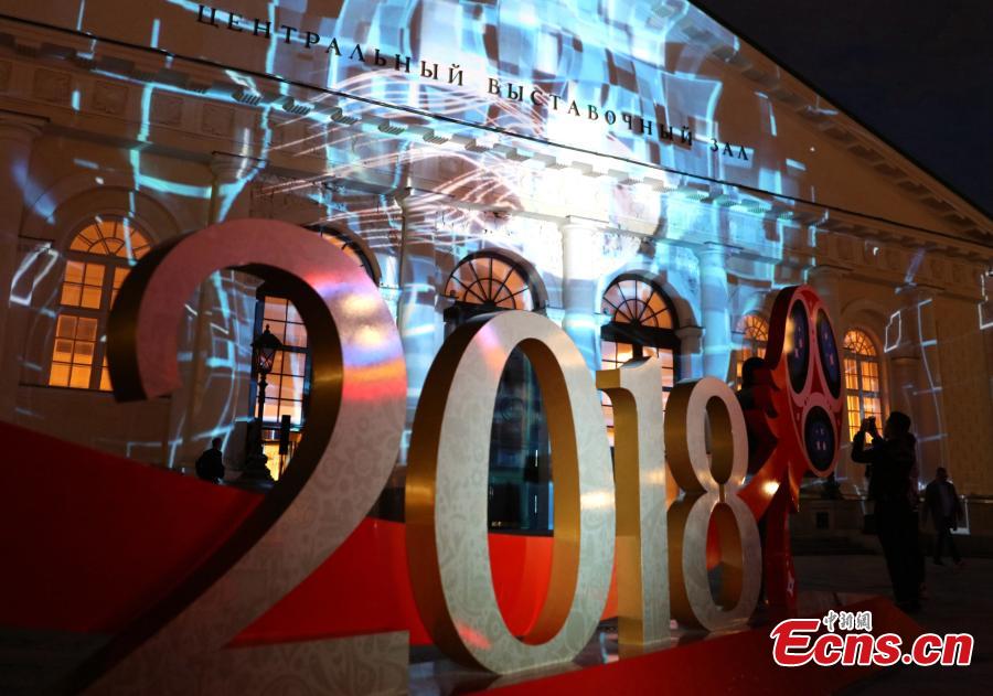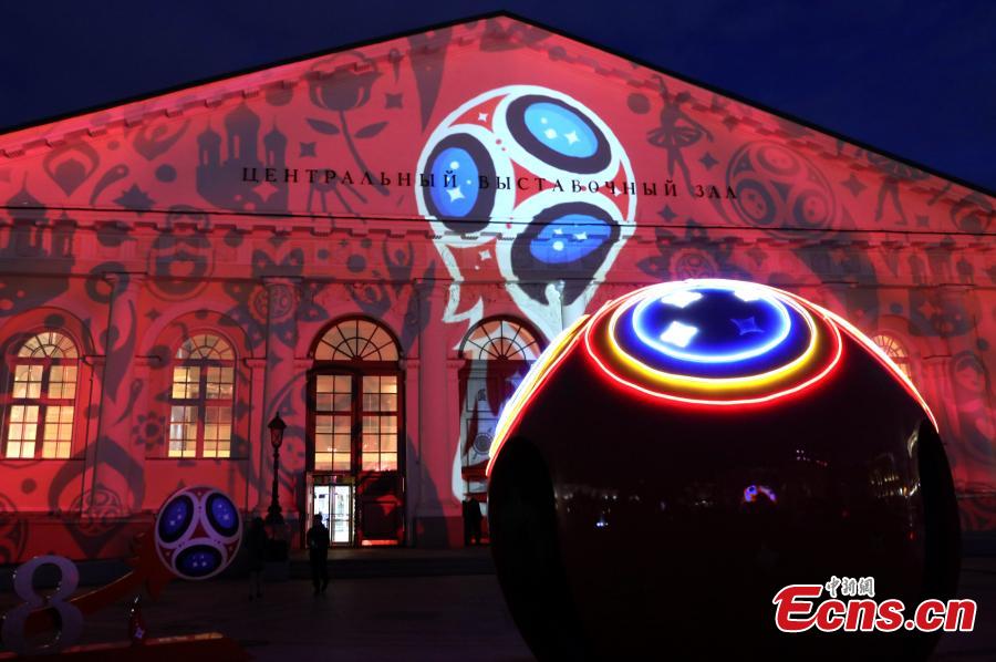 Colorful light installations dedicated to the 2018 FIFA World Cup open in Manezhnaya Square in Moscow, Russia, May 31, 2018. (Photo: China News Service/Wang Xiujun)