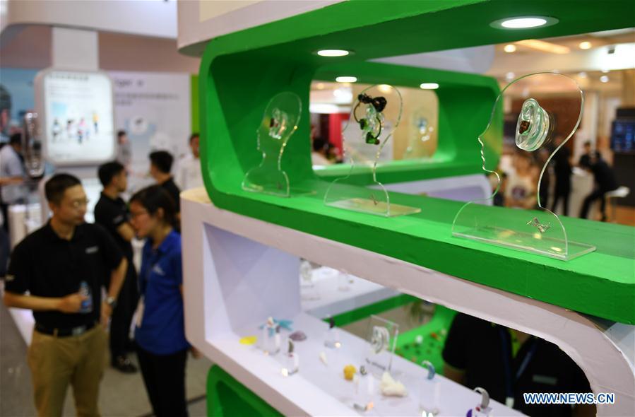 Hearing aid equipments are displayed at the 2018 Beijing International Audiology Conference in Beijing, capital of China, June 2, 2018. The 2018 Beijing International Audiology Conference kicked off here Saturday. (Xinhua/Zhang Chenlin)