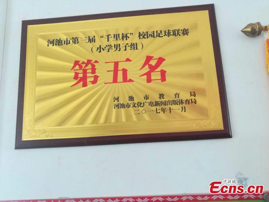A certificate congratulates the Liuye Central Elementary School boys football team on their fifth placing in Hechi City, Guangxi Zhuang Autonomous Region in 2017. The mountainous county, with a population of 400,000 people, is one the poorest in the region. (Photo: China News Service/Jiang Xuelin)