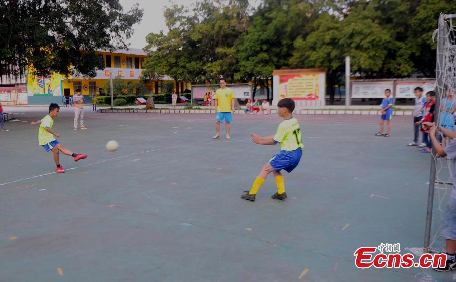 Children play football at Liuye Central Elementary School in Liuye Township, Dahua Yao Autonomous County, South China’s Guangxi Zhuang Autonomous Region. The mountainous county, with a population of 400,000 people, is one the poorest in the region. (Photo: China News Service/Jiang Xuelin)