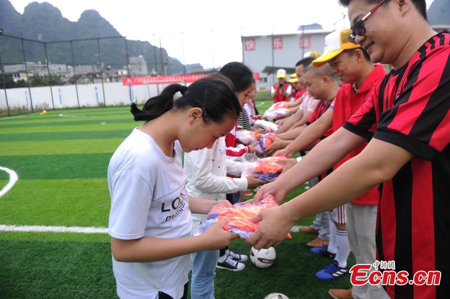 Volunteers from a road construction project donated football uniforms to Liuye Central Elementary School in Dahua Yao Autonomous County, South China’s Guangxi Zhuang Autonomous Region. (Photo: China News Service/Jiang Xuelin)