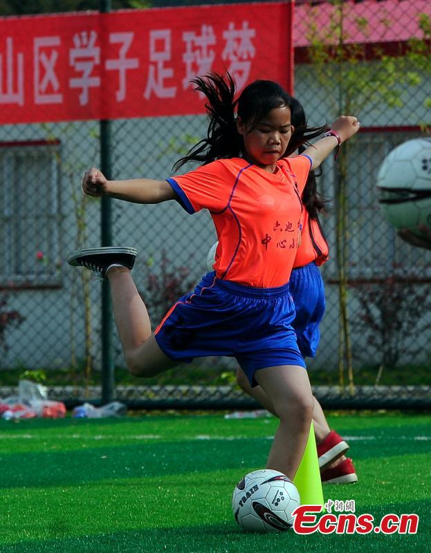 Due to the success of the school's boys football team, Liuye Central Elementary School has also established a team for girls. A total 100 out of 800 pupils at the school play football in Dahua Yao Autonomous County, South China’s Guangxi Zhuang Autonomous Region. (Photo: China News Service/Jiang Xuelin)