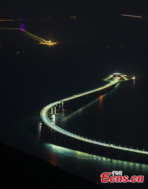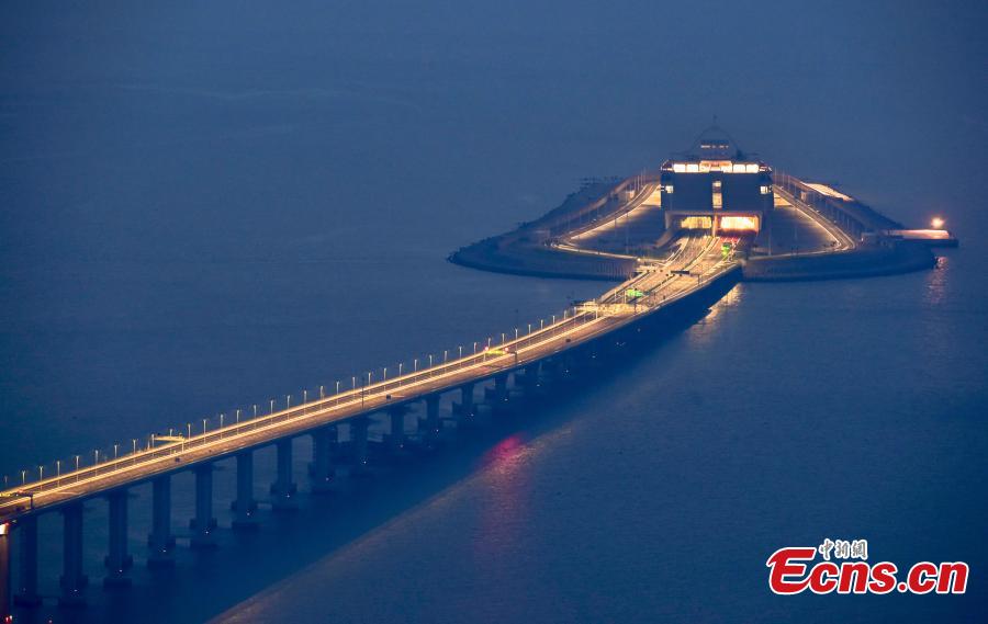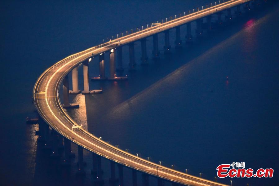 A view of part of the Hong Kong-Zhuhai-Macao Bridge, illuminated at night. The 55-kilometer Hong Kong-Zhuhai-Macao Bridge, the world's longest sea bridge, will slash the travel time between Hong Kong and Zhuhai from three hours to just 30 minutes, further integrating cities in the Pearl River Delta. (Photo: China News Service/Sheung Man Mak)