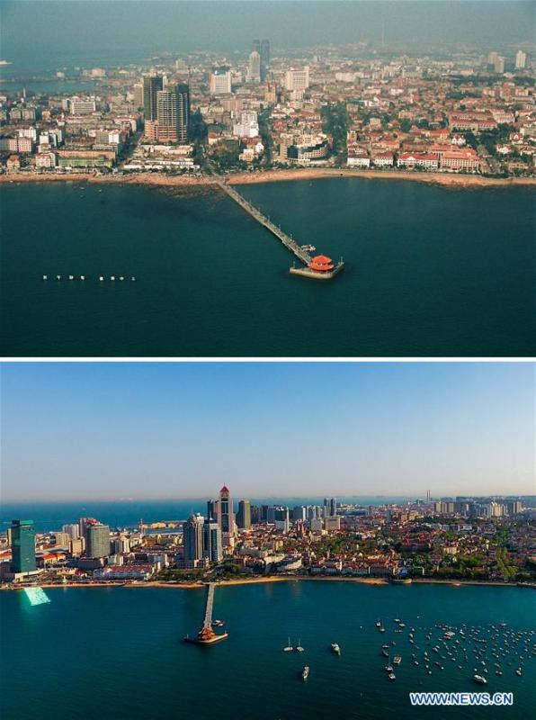 Combined photos show aerial views of Tuandao in Qingdao, east China's Shandong Province, taken respectively in 1996 (upper) and on May 4, 2018. Development of the coastal city can be seen from the file photos of Qingdao taken by photographer Zhang Yan on a helicopter since 1996 and the new ones taken by drones. Qingdao, as one of the first Chinese cities to open up, was an important port for the Belt and Road, and that people could sense the extensive, profound local culture and the vitality of China's reform and opening-up. (Xinhua/Zhang Yan, Li Ziheng)