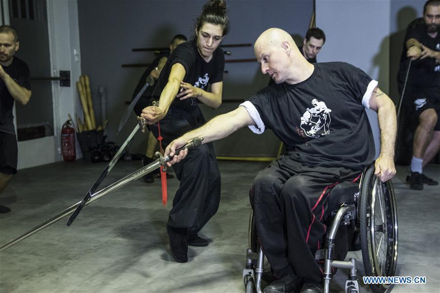 Kostas Moukas (front), a disabled Wushu teacher, teaches in his wheelchair, in Athens, Greece, June 5, 2018. Kostas Moukas started practicing Wushu since 2003 and is the only Wushu teacher in a wheelchair in Greece. He trains mixed classes that include seven disabled athletes who compete officially in the national championships. (Xinhua/Panagiotis Moschandreou)