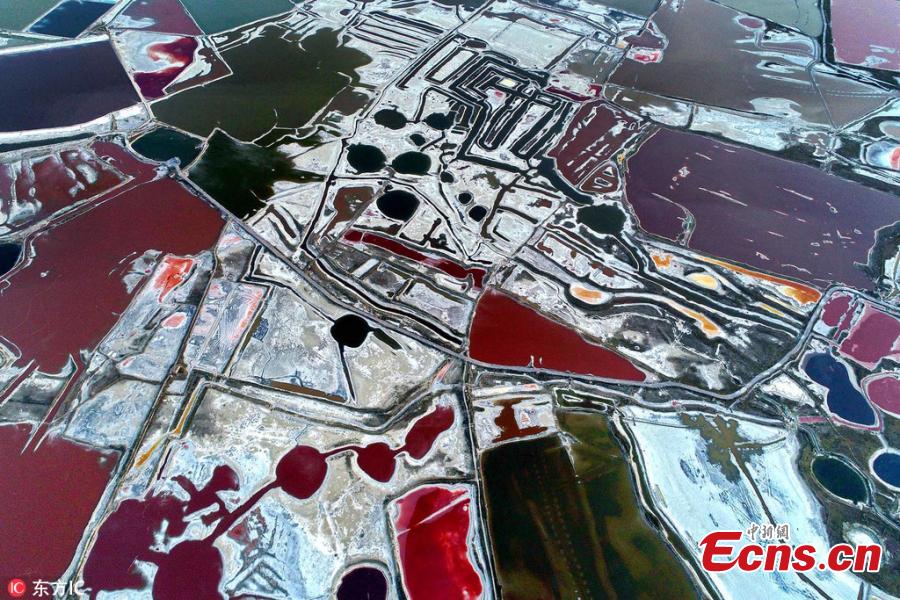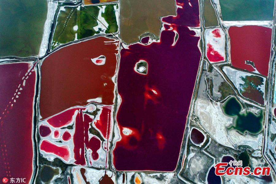 An aerial view of a colorful salt lake in Yuncheng, Shanxi Province, June 6, 2018. Formed approximately 500 million years ago, the salt lake, known as China's "Dead Sea", displays different colors as a result of microorganisms in the water. (Photo/IC)