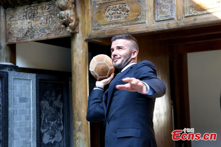 Former professional football star David Beckham plays cuju, known as the origin of modern football, at the Bengbu Ancient Buildings Expo Park ahead of the 2018 G-EXPO Global Top Summit in Bengbu City, East China’s Anhui Province, June 6, 2018. (Photo: China News Service/Zhong Xin)