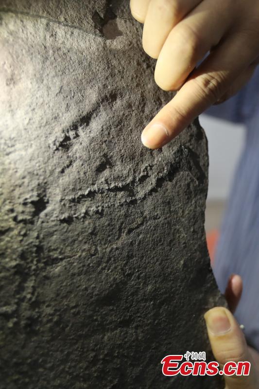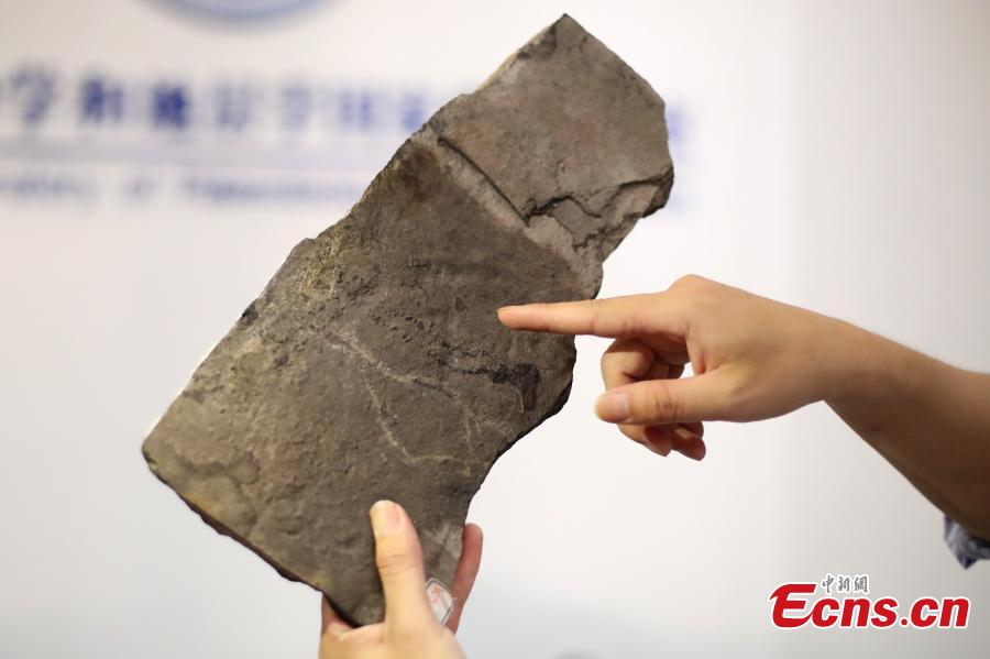 Chen Zhe, a researcher with the Nanjing Institute of Geology and Paleontology at the Chinese Academy of Sciences, shows the earliest known footprints left by an animal on earth, which date back at least 541 million years, in Nanjing, Jiangsu Province, June 7, 2018. Researchers from the institute and Virginia Tech University in the United States found the tracks in the Three Gorges area and published their report in the US journal Science Advances. (Photo: China News Service/Yang Bo)