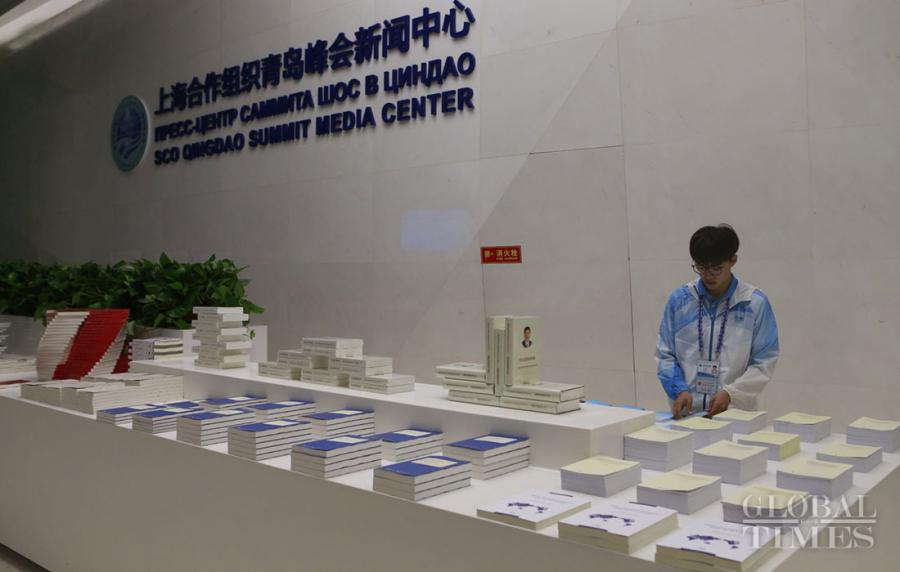A volunteer sorts the books and materials related to the 2018 SCO summit at the media center for the 18th Shanghai Cooperation Organization Summit in Qingdao, East China's Shandong Province, on June 7, 2018. (Photo: Li Hao/GT)