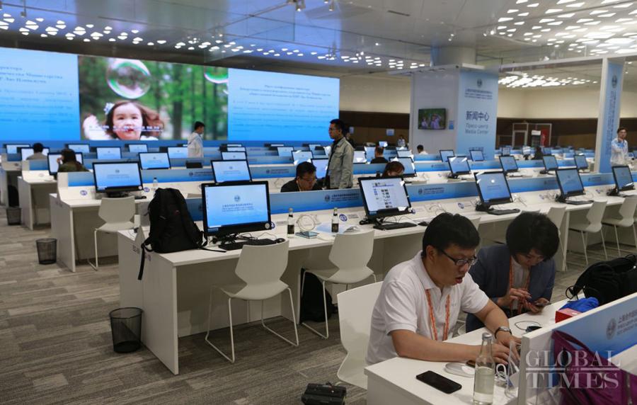 Journalists prepare in the media center of the Shanghai Cooperation Organization Qingdao Summit in Qingdao, East China's Shandong Province, on June 7, 2018. (Photo: Li Hao/GT)