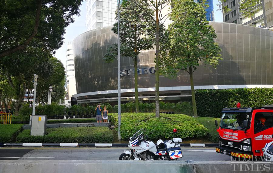 Singaporean police on patrol to ensure the security outside the St. Regis hotel where DPRK leader Kim Jong-un has stayed on Sunday. (Photo: Yang Sheng/GT)